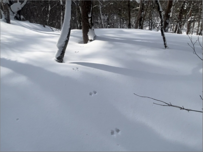 裏磐梯の森でよく見かける足跡はざっと、キツネ、タヌキ、ウサギ、リス、テン、ネズミって感じなんですが、日中でも出会い易いのが昼行性のリスさんなんです。