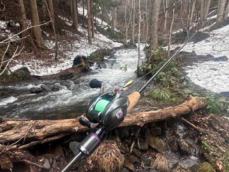 なるべく雪解け水を避けて、ほぼ雪が残っていない標高が低い渓流を選択しましたが、それでも谷には残雪が多くあり、水量も多かったですね。