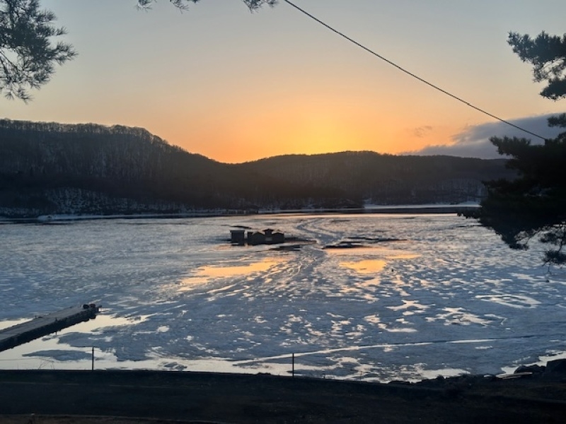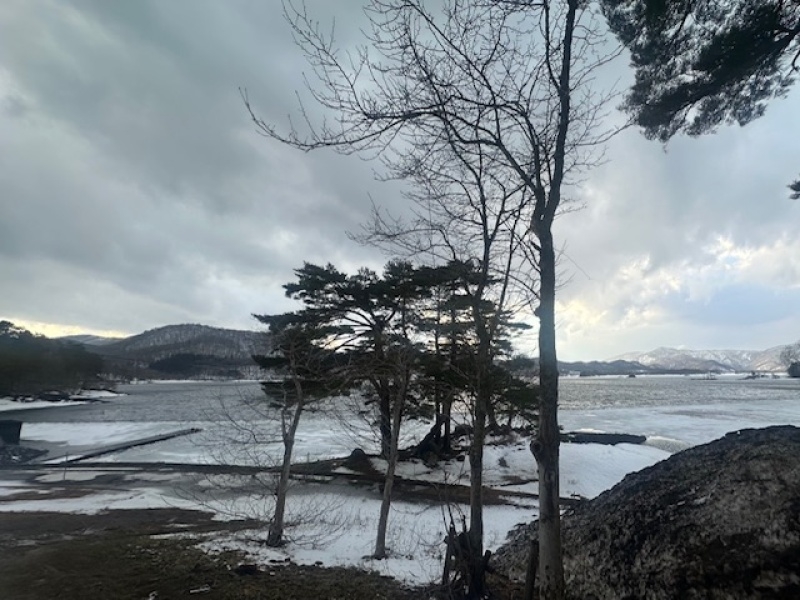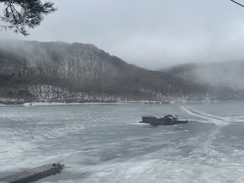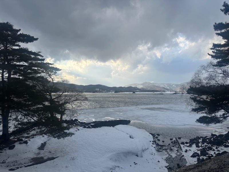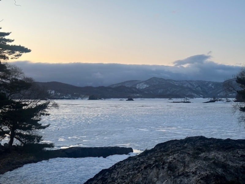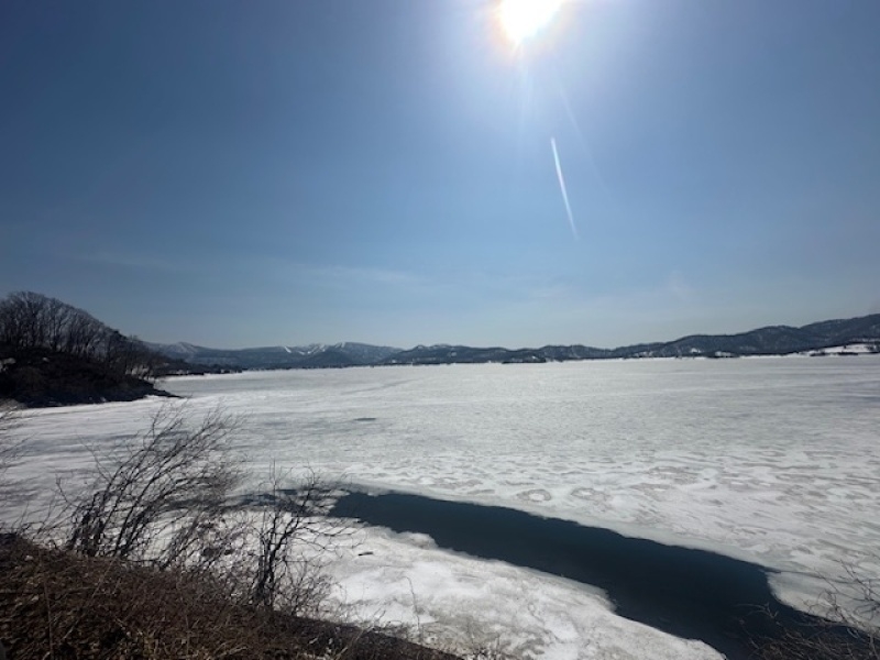 こちらは湖中央部。まだ雪と氷に閉ざされています。