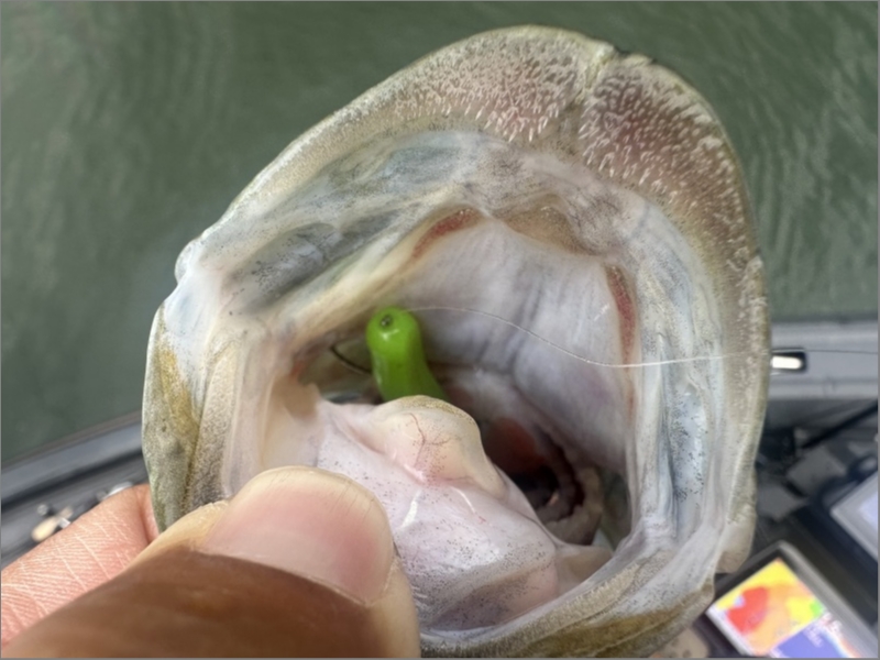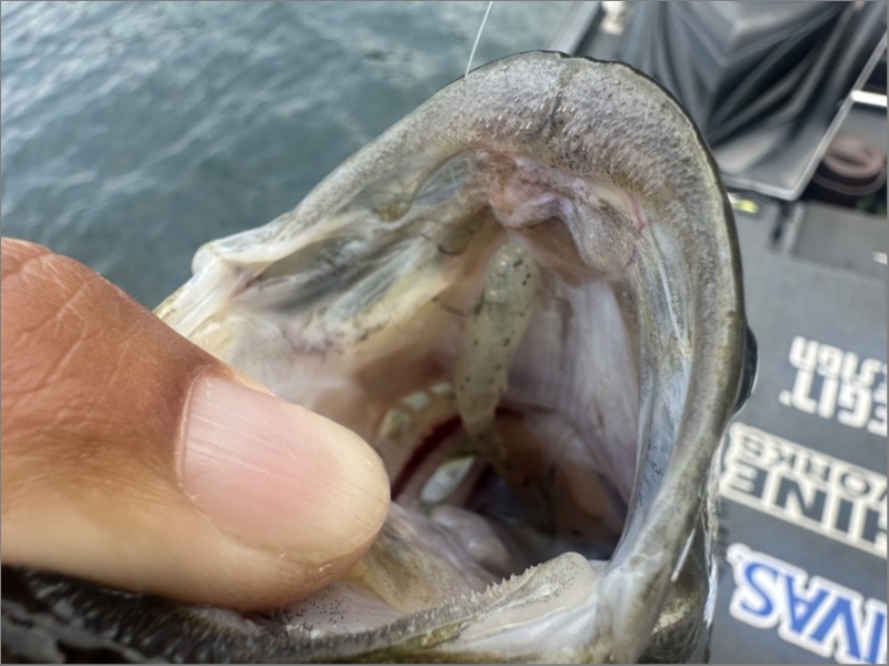 ディープ隣接のシャローでサイトで釣ったバス。釣る前から目飛び出してたけど、なぜこうなったんだろ?