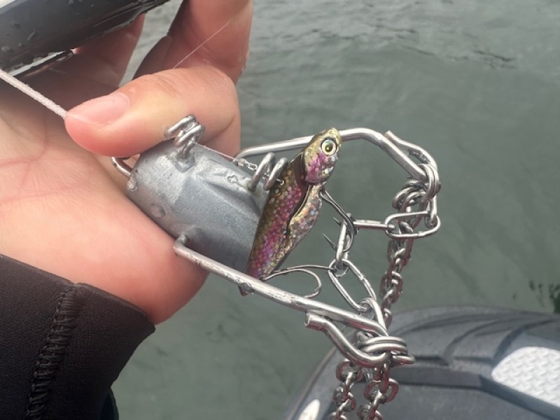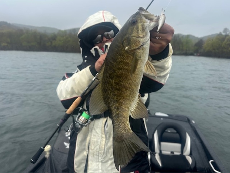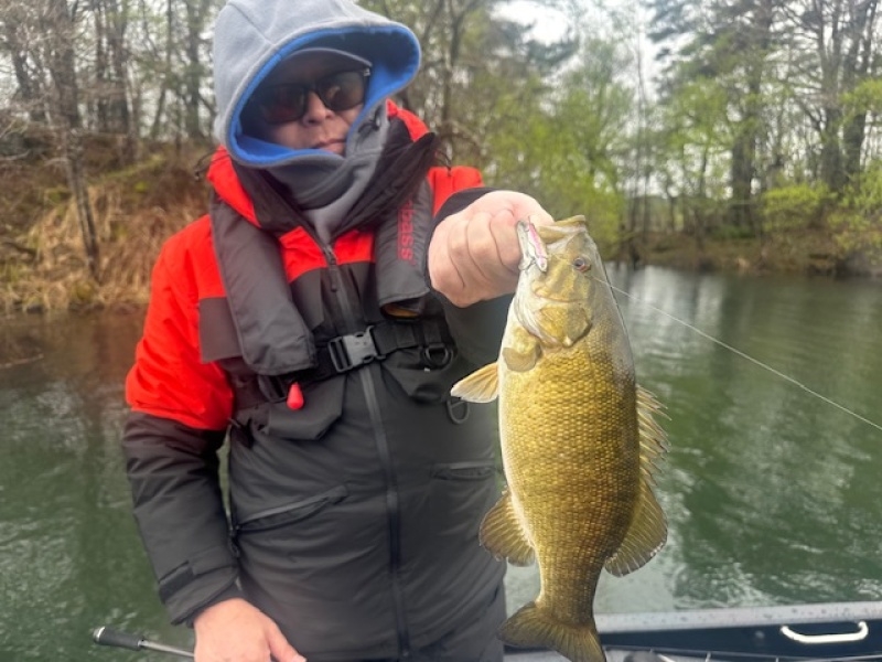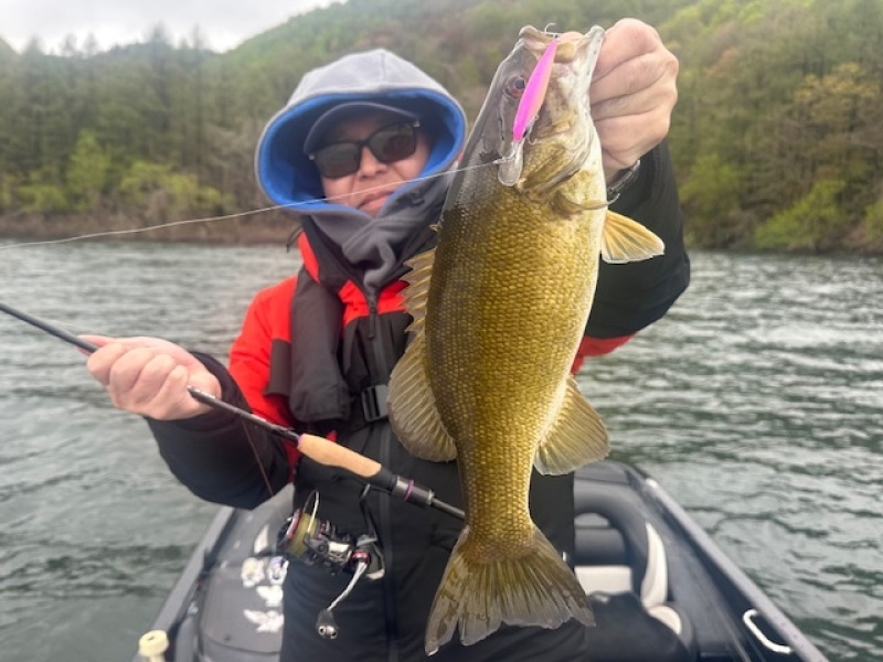 という事で、まずは風下の暖かい水に差して行く魚を狙いに行って、朝からシャッドで入れ食い。