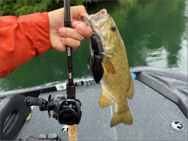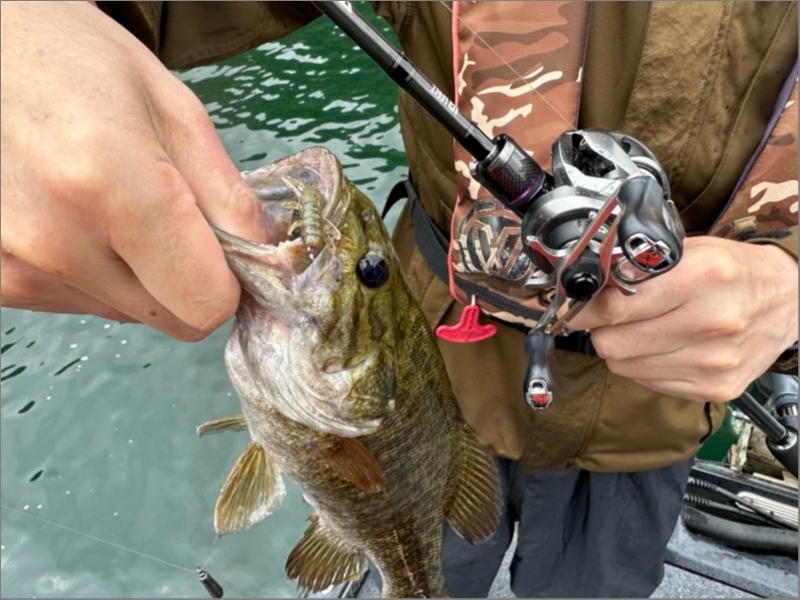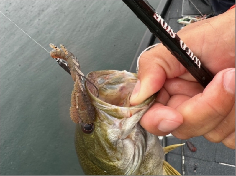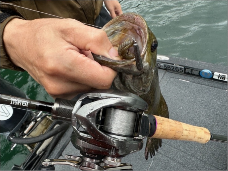 バンクの魚は全てベイトフィネスフリーリグで釣りましたが、バイトがあったら早めに掛けに行くおかげで良い場所に掛かってくれるし、フッキングとファイトが優しめなので飲み込まれても出血率が低く、出血しても大出血まで至る率も低め。