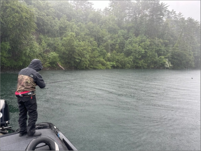 そんな大雨に誘われて、朝の2時間はビッグクローラーを投げてもらいましたが、軽ーい1バイトのみ。