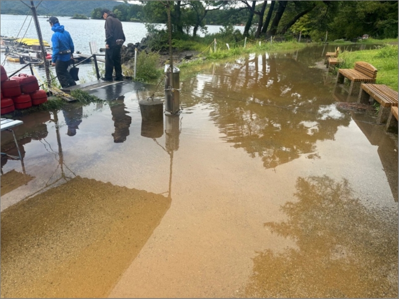 連日の大雨で急激な増水中の桧原湖。