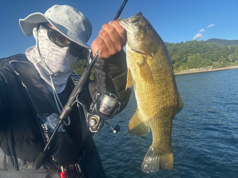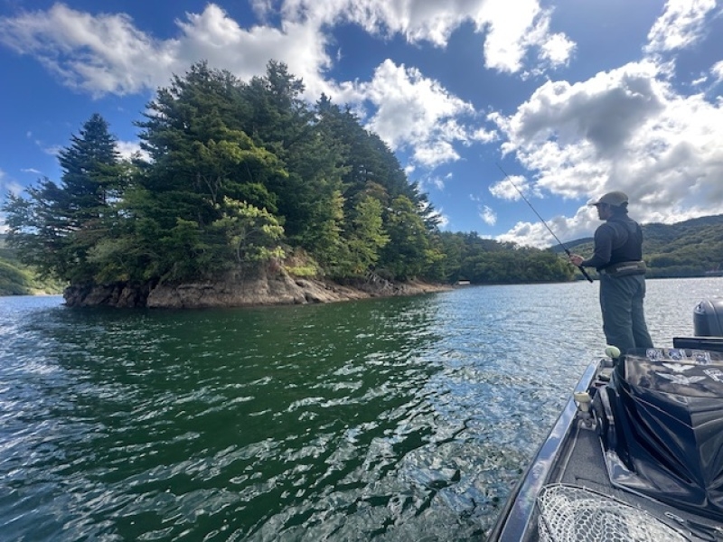 20〜30匹の群れで浮いて、ボトムのワカサギを食べに行き、また中層に戻るを繰り返している魚達を見つけた場所では何匹か続けて反応がありました。(ワームローテーションは必須)