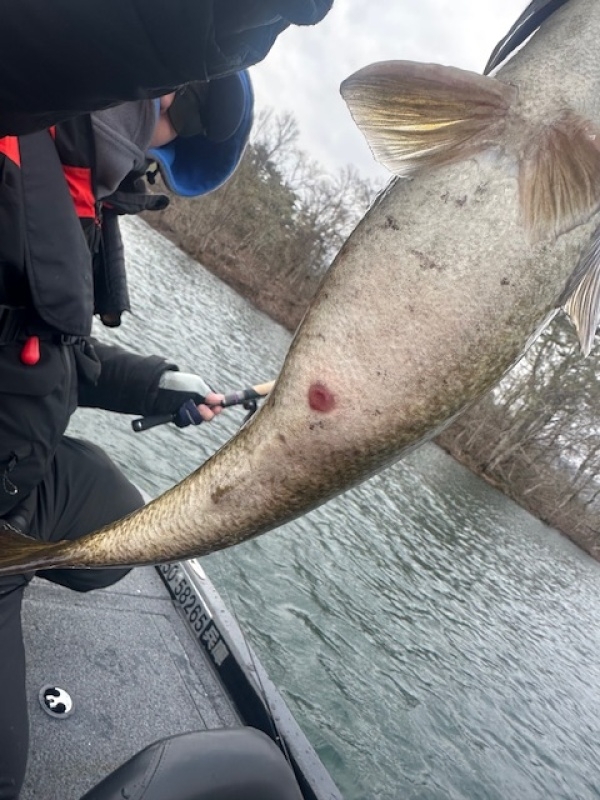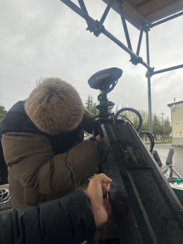 極寒暴風の中、ゲストのお二人といつまで釣りするか検討中にちょうど良く?エレキが壊れて早上がり。